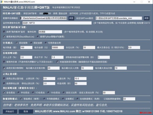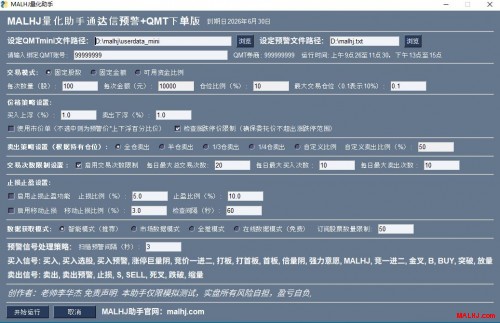 1.必须向自己的券商申请开通QMT交易功能, 2.必须要有比较好的量化方案或者预警策略。 否则建议先学习MALHJ专业系列公式:http://www.malhj.com/read-201.html MALHJ量化助手让自动交易更简单, 支持99%的券商QMT 支持同花顺动态板块及自选股自动交易, 也支持通达信预警打板及一进二等买卖功能, 详情看文字介绍或视频讲解: 一.MALHJ量化助手相关视频: 1.同花顺动态板块实现自动交易的方法 2.通达信预警自动交易的全部过程和方法 3.MALHJ量化助手同花顺加QMT完成自动交易的方法 4.如何开通QMT量化交易功能 5.如何轻松零基础零编程能力实现量化交易 6.通达信预警实现量化自动交易的演示 二.MALHJ量化助手通达信专业版基本功能如下 1.分三种交易模块,固定股数,固定金额,可用资金比例 2.买卖上下浮价格笼子委托 3.市价委托或限价委托 4.卖出策略分全仓,半仓,1/3仓,自定义比例 5.数据获取方式,智能模式。 6.风控模式交易限制 7.风控止损止赢 8.移动止损止赢模式 9.可设置移动止损止赢刷新时间秒 10.可设置预警扫描时间秒 11.买卖预警信号处理策略,只买卖相关的预警(与免费版有很大区别) MALHJ量化助手通达信专业版设置效果图:以最新版为准 图片:121.JPG MALHJ量化助手通达信全功能专业定制年版 图片:122.JPG MALHJ量化助手QMT+同花顺专业版基本功能如下 1.分三种交易模块,固定股数,固定金额,可用资金比例 2.买卖上下浮价格笼子委托 3.市价委托或限价委托 4.卖出策略分全仓,半仓,1/3仓,自定义比例 5.数据获取方式,智能模式。 6.风控模式交易限制 7.风控止损止赢 8.移动止损止赢模式 9.可设置移动止损止赢刷新时间秒 10.支持同花顺动态板块和自选股。 MALHJ量化助手QMT+同花顺专业版设置效果图 图片:123.JPG MALHJ量化助手通达信预警+QMT下单专业版 MALHJ量化助手同花顺动态板块版价格一样, 在定制购买时请告诉需要哪一个软件的MALHJ量化助手: 特别提醒:绑定QMT帐号+绑定券商,在使用期内不可更改。换绑另外重新购买,购买前请请认真阅读【风险揭示书】,选择即代表您完全认可协议的内容,量化有风险,投资需谨慎。 1.MALHJ量化助手专业年版:680元/年, 赠送MALHJ通用系列公式一份。 2.MALHJ量化助手专业五年版:1980元/5年 赠送MALHJ专业版系列公式一份详情:http://www.malhj.com/read-185.html 3.MALHJ量化助手永久版:3680元长期可用 赠送MALHJ专业版系列公式一份详情:http://www.malhj.com/read-185.html 想更多了解MALHJ量化助手专业版的粉丝可加 微信号:w1968131366(非诚勿扰,不喜勿加) 手机微信同号:15907742318(非诚勿扰,不喜勿加) 。 或者扫码加好友